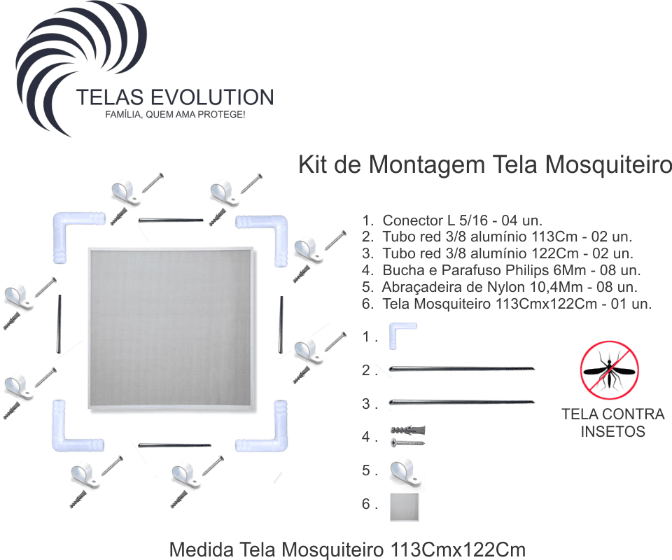 O kit tela mosquiteiro é produzido com tubo redondo de alumínio, proporcionando leveza, resistência e excelente durabilidade. Possui conectores tipo cotovelo de 5/16, que garantem um encaixe firme e acabamento bem estruturado.